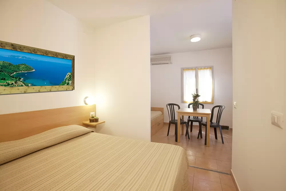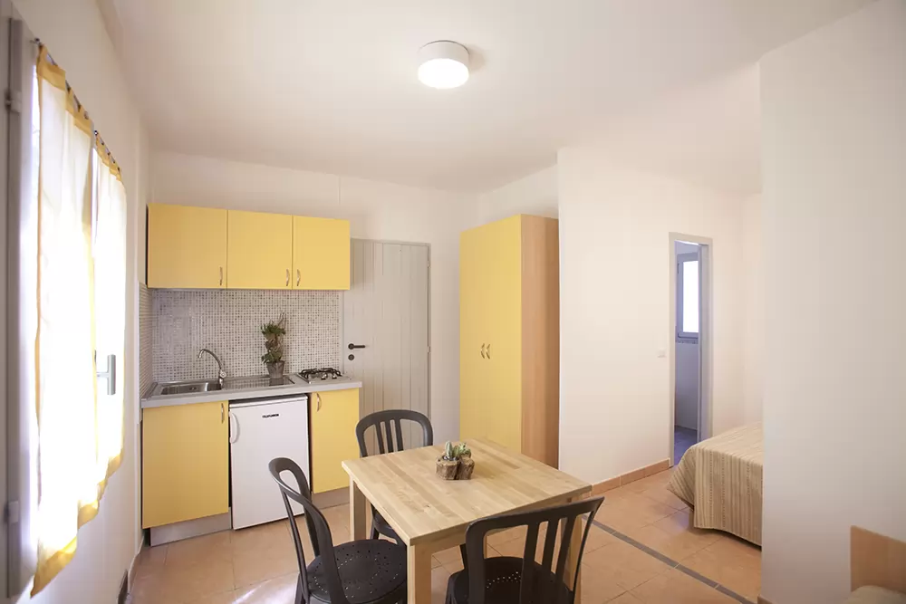Il bungalow in tipologia bilocale è composto da una stanza matrimoniale, soggiorno con angolo cottura e divano-letto a due posti, bagno con doccia, aria condizionata, veranda esterna; sono in dotazione stoviglie, posate ed utensili per cucinare; non è compresa la biancheria. La spiaggia è libera e dista ca. 70 m. con accessi interni al campeggio